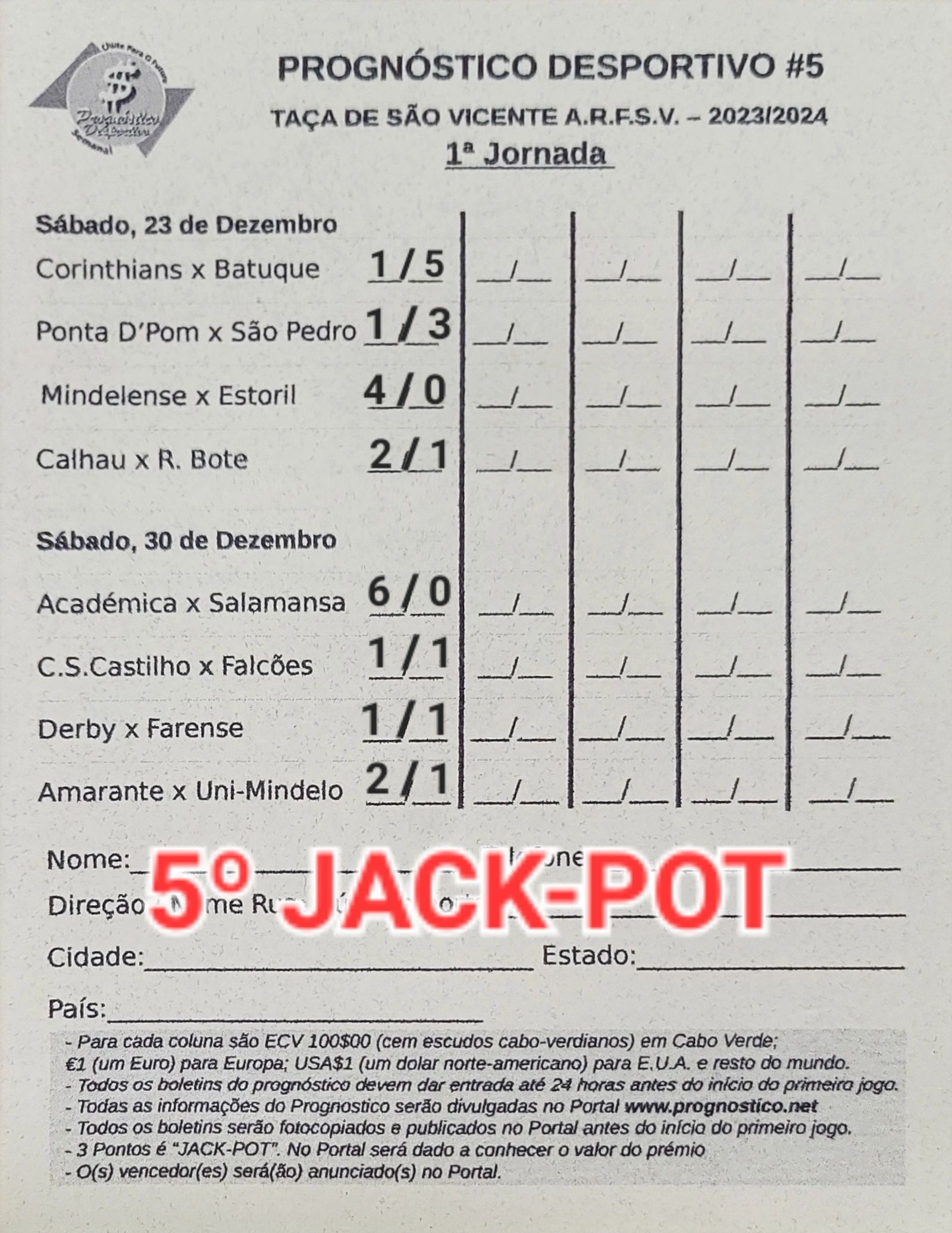 SEGUNDO JACK-POT DO PROGNÓSTICO DESPORTIVO DO TORNEIO DE ABERTURA DE S.VICENTE