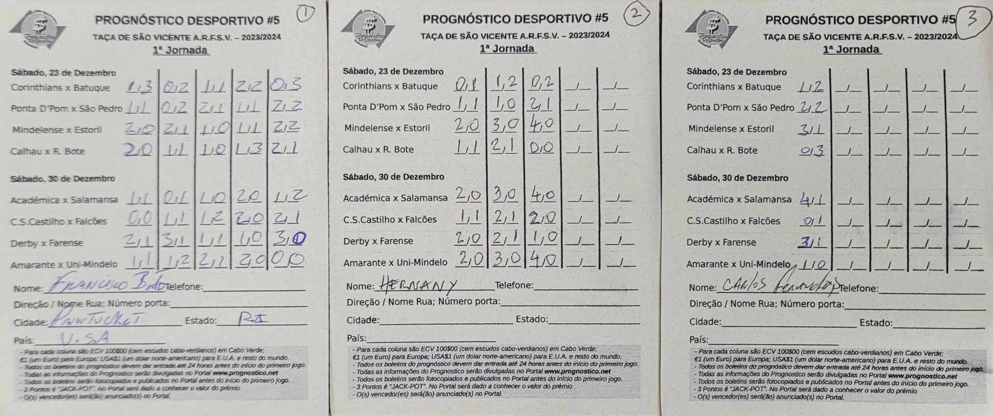 Três apostadores, todos de S.Vicente somaram cada três pontos. São os boletins números 14, 16 e 17.